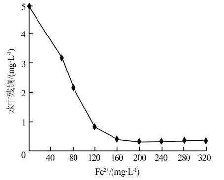 而处理络合废水的重要条件在于控制酸性条件使络合物充分离解,因此酸化反应时间对除铜效果有一定影响。控制反应pH在4.95~4.97,终点pH在8.82~8.86,Fe2+为320 mg/L,考察酸化时间对除铜效果的影响。当反应时间分别为5、10、15、20时,出水中残余Cu2+均<0.20 mg/L,选择15 min为宜。