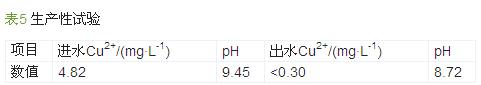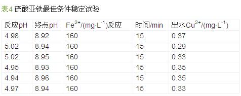 由图1看出,硫酸亚铁投加量为160 mg/L就可使出水Cu2+降到0.5 mg/L以下〔6〕。为验证工艺可靠性进行了最佳条件稳定试验(结果见表 4)和生产性试验(处理量17 m3,沉降时间18 h,结果见表 5),均获得稳定良好的除铜效果。