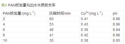 由于铜及重金属的氢氧化物沉淀颗粒非常细,沉淀时间要经过15~20 h,脱水性能也差。为促进凝聚,完成固液分离,考虑投加聚丙烯酰胺(PAM)。PAM可以采用阴离子型,亦可采用阳离子型〔7〕。至于投加PAM溶液的浓度,需考虑两个方面:一是力求获得较高的絮凝效果,二是要在生产中切实可行。根据絮凝理论,当投加量相同时,投加液的浓度越低,絮凝效果就越好。这是因为投加浓度越低,PAM的活性基团与水中粒子的接触与结合就越强,越均匀,这样一来能使水中粒子都进入架桥作用范围内。若投加液的浓度过高,短时间内会出现局部浓度过高,部分微粒占有过多的活性基团,使架桥作用难以发生〔8〕。所以投加PAM时应选择低浓度溶液。在反应pH为5.0、Fe2+为160 mg/L,酸化时快搅1 min(120~140 r/min),慢搅10~15 min(30~40 r/min),静置15 min条件下,考察 PAM投加量对出水水质的影响,见表6。