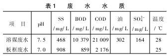 华中医药集团以生物发酵法生产乙酰螺旋霉素为主,年产量450t,生产发酵抗生素生产过程中有微生物发酵以及分离提取等几个主要工序,生产原料除了粮食以外还需要大量的有机溶剂。在上述一系列生产操作过程中会产生不同种类的有机废水,各种废水的有机污染程度变化大,部分废水属高浓度有机废水,废水中含有残留的抗生素和溶媒,对微生物具有一定的抑制作用,同时废水中含有不少生物发酵代谢所产生的生物难降解物质,其综合生物降解性能差。生产乙酰螺旋霉素产生的废水主要分两部分:一部分为溶媒废水,废水主要成分为脂类、醇类和发酵过程中的一些代谢产物及抗生素残留物;另一部分为板框废水,废水中主要成分为菌丝体,悬浮物较多。两种废水的水质情况见表1。