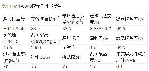 ·´ÉøÍ¸ÏµÍ³ÊÇÕû¸öË®´¦ÀíϵͳµÄÍÑÑκËÐÄ£¬·´ÉøÍ¸Ä¤¿É³ýȥˮÖоø´ó²¿·Ö¿ÉÈÜÐÔÑΣ¬ÒÔ¼°È«²¿½ºÌåºÍ΢ÉúÎ±£Ö¤Á˳öˮˮÖÊ£¬ÎªºóÐø¹¤ÒÕÌṩÓÅÖÊˮԴ¡£ÓÉÓÚÏîÄ¿½øË®ÊÇÎÛË®´¦Àí³§µÄÅÅ·ÅË®£¬×ǶȺÍCODÈÔÈ»½Ï¸ß£¬Òò´ËÑ¡ÓþÛõ£°·¸´ºÏ¿¹ÎÛȾĤFRϵÁУ¬¸ÃϵÁз´ÉøÍ¸Ä¤²ÉÓÃÌØÊ⹤ÒÕ¶ÔĤ±íÃæ½øÐд¦Àí£¬¸Ä±äÁËĤƬ±íÃæµÄ¹â»¬¶È£¬Ôö¼ÓÁËĤ±íÃæÇ×Ë®ÐÔ£¬Ä¤±íÃæµçºÉÒ²Ç÷ÓÚÖÐÐÔ£¬Í¬Ê±²ÉÓÃ¿í½øË®Á÷µÀÍøÉè¼Æ£¬´Ó¶ø¼õÉÙÁËÎÛȾÎP΢ÉúÎïÔÚĤ±íÃæµÄÎÛȾ£¬ÑÓ³¤ÁËĤµÄʹÓÃÊÙÃü£¬ÊÊÓÚÔ¤´¦ÀíºóµÄÎÛË®»ØÓá£Ä¤ÐͺÅΪFR11-8040£¬ÎªD 201 mm¡Á1 016 mmµÄ¾íʽ×é¼þ£¬ÐÔÄܲÎÊýÈç±í 3Ëùʾ¡£¸Ã·´ÉøÍ¸ÏµÍ³ÎªÒ»¼¶Á½¶ÎʽÉè¼Æ£º£¨6¡Ã4£©¡Á6£¬Ä¤Ôª¼þÊýÁ¿Îª60Ö§£¬Éè¼Æ²úË®Á¿Îª40 m3/h£¬Éè¼Æ»ØÊÕÂÊΪ70%£¬Î¶ÈΪ25 ¡æ¡£