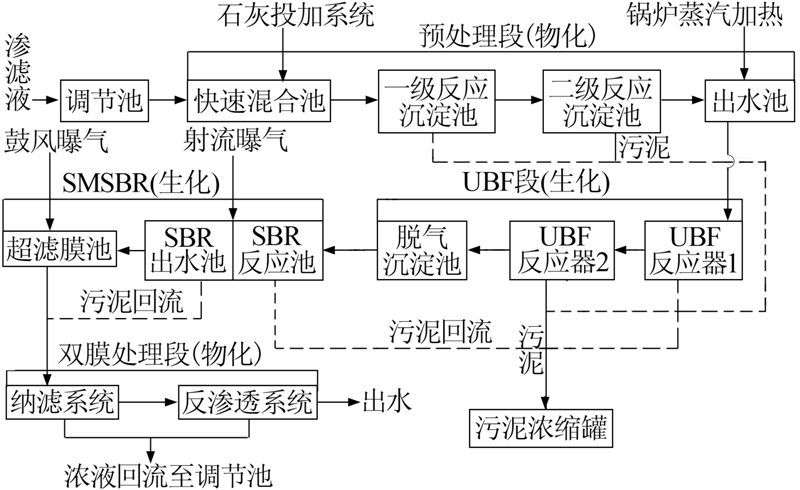 渗滤液首先进入调节池调节水量水质,随后通过泵抽送至预处理段中的快速混合池并投加石灰,调节其pH至弱碱性。此后进入一级、二级反应沉淀池并分别投加混凝剂和絮凝剂,其出水利用外来蒸汽加热至30 ℃左右后进入生化段。生化段由两级UBF段(厌氧)和SMSBR段(好氧)组成。在两级UBF段,处理液由UBF反应器底部进入,依次经过厌氧污泥床和填料生物膜区,最后在反应器顶部进行固液气三相分离,之后处理液自流至脱气沉淀池脱除沼气和污泥,而UBF反应器产生的沼气通过燃气管道收集储存用来发电或燃烧处理〔4, 5〕。处理液进入SMSBR段通过好氧处理进一步降解有机物,其出水至超滤膜池并进行鼓风曝气强化生物处理〔6〕。生化段出水至双膜段(纳滤、反渗透)进行深度处理,在该段处理液中的难降解有机污染物通过膜的筛分、截留和吸附等作用被去除掉〔7〕,可使最终出水达标直排入海。系统产生的污泥经污泥管道收集后进入污泥浓缩池进行重力浓缩。浓缩后的污泥由泵输送至离心脱水机机械脱水,脱水干污泥外运或送至焚烧车间焚烧处理。