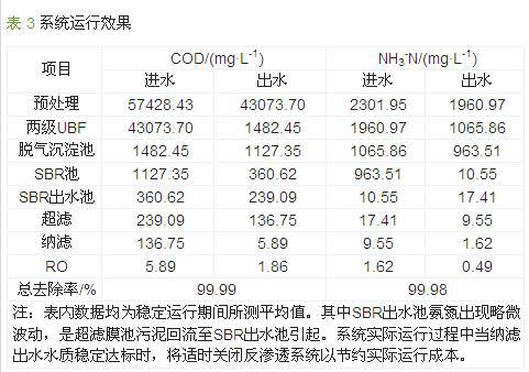(4)深度处理段运行效果。深度处理系统由双膜(纳滤、反渗透)组成,主要是利用半透膜的选择性,在常温下以膜两侧压力差为动力,对预处理段及生化段未能去除的难降解有机物进行分离去除〔9〕。双膜处理段进水COD均值为136.75 mg/L、NH3-N均值为9.55 mg/L,出水COD均值为1.86 mg/L、NH3-N均值为0.49 mg/L,COD去除率达98.64%,NH3-N去除率达94.87%。