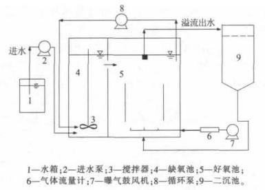 ÊÔÑé×°Öü°¹¤ÒÕÁ÷³ÌÈçͼ 1 Ëùʾ¡£ ·´Ó¦Æ÷ÓÉÓлú²£Á§ÖƳɣ¬¹¤×÷ÈÝ»ý 10 L£¬ÐÎ״Ϊ³¤·½Ìå £¬·ÖΪÁ½¸ö¸ñÊÒ £¬Ç°Ò»¸ö¸ñÊÒÑáÑõÔËÐÐ £¬Õ¼·´Ó¦Æ÷×ÜÌå»ýµÄ 1/3£¬ºóÒ»¸ö¸ñÊÒºÃÑõÔËÐÐ £¬Õ¼·´Ó¦Æ÷×ÜÌå»ýµÄ 2/3¡£·Ö±ðÔÚºÃÑõÇøºÍÑáÑõÇøÁªÍ¨´¦¡¢ ºÃÑõÇøÖÁÑáÑõÇø»ØÁ÷¿ÚÒÔ¼°ÒçÁ÷³öË®¿ÚÉèÖøñÍø £¬±£Ö¤°üÂñ¹Ì¶¨»¯¾ú¿ÅÁ£±»À¹½ØÔÚ·´Ó¦Æ÷ºÃÑõÇøÖÐ ¡£