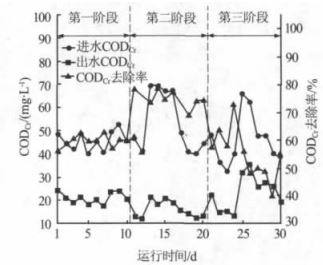 ÔÚÊÔÑé½×¶Î £¬²É¼¯ºÓË®ÒòÕÇË® ¡¢ ÏÂÓê ¡¢ ºÓÁ÷ÉÏÓÎÅÅÎÛÇé¿öµÈ¶øÊ¹ÔˮˮÖʳÊÏÖÒ»¶¨²¨¶¯ÐÔ£¬ÔË®½øË®Æ½¾ù CODCr Ϊ 48.18 mg/L£¬ÊôÓÚ ¡¶µØ±íË®»·¾³ÖÊÁ¿±ê×¼¡·£¨GB 3838¡ª2002£© ÖÐÁÓ¢õ Àà¡£ ÒÔÔË®²ÉÈ¡Á¬Ðø½øË®µÄ·½Ê½£¬·Ö 3 ½×¶ÎÔËÐУ¬Ã¿½×¶Î¾ù¿¼²ìѱ»¯Îȶ¨ºó´¦ÀíЧ¹û£¬²»Í¬½×¶Î CODCr µÄÈ¥³ýЧ¹û¼ûͼ 2¡£