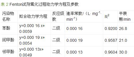 (3)Fenton氧化处理苯酚、间甲酚、邻甲酚废水均符合二级动力学模式,其氧化速率顺序为间甲酚>苯酚>邻甲酚。