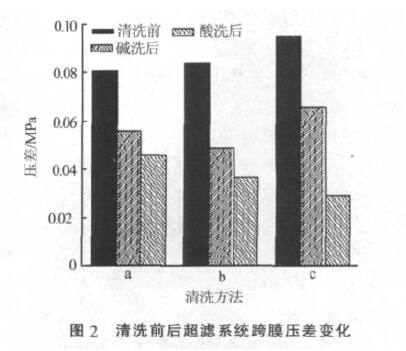 Çåϴǰºó³¬ÂËϵͳµÄ¿çĤѹ²î±ä»¯Èçͼ2Ëùʾ¡£´Óͼ2¿ÉÒÔ¿´³ö£¬3ÖÖÇåÏ´·½·¨¶¼ÊÇÓÐЧµÄ£¬²¢ÇÒ·½·¨cµÄЧ¹û×îºÃ£¬³¬ÂËϵͳµÄ¿çĤѹ²î´Ó0.095MPaϽµµ½0.029MPa¡£
