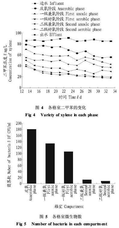 2.1.2 反应器启动过程中各隔室邻苯二甲酸二丁酯和二甲 苯的降解情况。由图3可知,进水邻苯二甲酸二丁酯和二甲 苯的浓度分别约为150和86 mg/L。虽然造纸废水较难降 解,但其中也有可溶性的易降解的有机物,这些有机物可为 微生物的生长提供碳源和能量,从而促进邻苯二甲酸二丁酯 和二甲苯降解。微生物降解葡萄糖时可产生与降解邻苯二 甲酸二丁酯和二甲苯相似的酶,从而促使邻苯二甲酸二丁酯 和二甲苯较快降解。反应器启动34 d时,邻苯二甲酸二丁酯 的降解率从刚启动时的49%逐渐上升到75%,出水邻苯二 甲酸二丁酯的浓度为37.5mg/L;二甲苯的降解率从55%逐 渐上升到78%,出水二甲苯的浓度为19 mg/L,说明适应邻苯二甲酸和二甲苯的微生物已驯化成功。