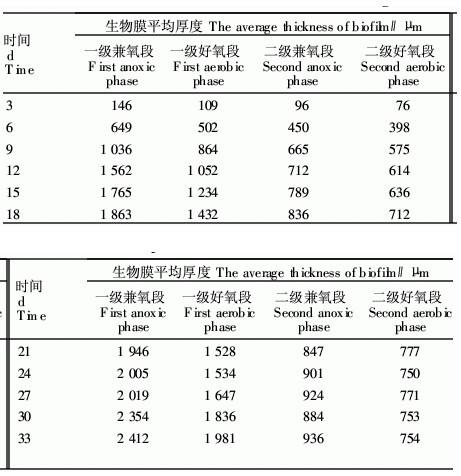 2.2.2 不同格室生物膜的厚度。由表1可知,随水流方向 COD降低,生物膜平均厚度逐渐减小;生物膜厚度随反应器 启动时间的延长逐渐增厚,最后基本稳定在一定范围内。到 第33天,一级兼氧段生物膜平均厚度达到2 412μm,而二级 好氧段生物膜厚度只有754μm,说明COD浓度越高,为微生 物提供的能量越多,生物膜越厚。一级兼氧段、一级好氧段生物膜颜色较深(深褐色),二级兼氧段、二级好氧段生物膜 颜色较浅(黄褐色)。第12天加入邻苯二甲酸二丁酯、二甲苯后生物膜发黑,微生物受到有毒物质冲击, 7d后,生物膜 又逐渐恢复到原来的颜色,说明不适应这种水质的微生物已被淘汰。观察生物膜可及时了解微生物的生长状况,从而及时发现反应器运行过程中存在的问题。
