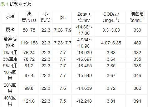 ÊÔÑéÔÚ6 Ô¡ª7 Ô½øÐУ¬ÊÔÑéÆÚ¼ä£¬Ë®³§ËùÓûìÄý¼ÁΪ¾ÛºÏÂÈ»¯ÂÁ£¨PAC£©£¬Í¶¼ÓÖÊÁ¿Å¨¶ÈΪ10¡«15 mg/L¡£Ë®³§ÔË®¡¢Â˳ط´³åÏ´Ë®»ìºÏÑù¡¢²»Í¬»ØÓñÈÏ»ìºÏË®ÑùË®Öʼû±í 1¡£
