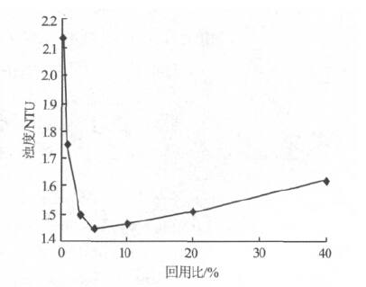 ÓÉͼ 2 ¿ÉÒÔ¿´³ö£¬³ÁºóË®×ǶÈËæ×Å»ØÓñȵÄÔö´ó³ÊÏȽµµÍºóÉý¸ßÇ÷ÊÆ£¬»ØÓñÈΪ5%¡«10%ÊÇתÕÛÇø¼ä¡£·ÖÎöÈÏΪ»ØÓñÈСÓÚ10%³öÏÖµÄ×ǶȽµµÍµÄÏÖÏóÊÇÓÉÓÚ¼ÓÈëÊʵ±±ÈÀýµÄ·´³åÏ´·ÏË®£¬¶ÔË®µÄ»ìÄý³ÁµíÆð×ÅÓÐÀû×÷Ó᣶øµ±·´³åÏ´Ë®µÄ±ÈÀý´óÓÚ 10%³öÏÖµÄ×Ƕȱä´óµÄÇé¿ö£¬Õâ¿ÉÄÜÊÇÓÉÓÚ·´³åÏ´Ë®¼ÓÈë¹ý¸ßÔö¼ÓÁËË®µÄ×Ƕȣ¬µÖÏûÁË·´³åÏ´Ë®ÖÐÐõÌå¶Ô»ìÄýµÄÓÐÀû×÷Óá£