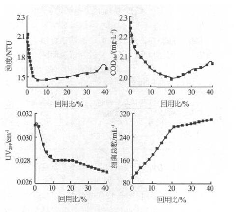 £¨2£© ʵÑé½á¹û±íÃ÷£º ·´³åÏ´·ÏË®»ØÓñÈСÓÚ 10%¿ÉÒÔÓÐÀûÓÚ×ǶȵÄÈ¥³ý£¬»ØÓñȴóÓÚ10%£¬Ë®µÄ×ǶȳÊÉÏÉýµÄÇ÷ÊÆ£» ͬÑù·´³åÏ´·ÏË®»ØÓÃÓÐÀûÓÚ CODMn È¥³ý£¬²¢ÇÒ¿ÉÒÔС·ù½µµÍ³ÁºóË®µÄUV254£¬Óë²»»ØÓÃÏà±È£¬»ØÓñÈΪ10% ʱ£¬UV254 ½µµÍÁË 0.003 cm-1 £»µ«ÊÇ»ØÊÕÂ˳ط´³åÏ´Ë®Ã÷ÏÔÌá¸ßÁ˳Áºóˮϸ¾ú×ÜÊý£¬Óë²»»ØÓÃÏà±È£¬»ØÓñÈΪ10%ʱϸ¾ú×ÜÊýÔö³¤ÁË´óÔ¼1 ±¶×óÓÒ£¬»ØÓñÈÀý´óÓÚ10%ʱϸ¾ú×ÜÊý¼±¾çÔö³¤¡£