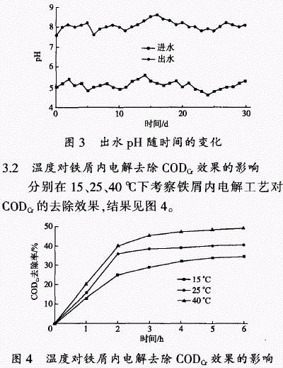 ÓÉͼ4¿ÉÖª¡£Ëæ×ÅζȵÄÉý¸ß£¬ÌúмÄÚµç½â·¨¶ÔӡȾ·ÏË®CODcrµÄÈ¥³ýÂÊÔö´ó£¬Î¶ÈΪ4O¡æÊ±µÄCOD crÈ¥³ýÂʽӽü50%£¬±ÈζÈΪ25¡æµÄCODcrÈ¥³ýÂʸ߽ü10%¡£¿¼Âǵ½·ÏË®¹¤ÒÕµÄʵ¼ÊÓ¦Ó᣷ÏˮˮÎÂΪ18¡«35¡æ £¬Æ½¾ùζÈΪ25¡æ×óÓÒ£¬¿¼Âǵ½Èç¹û½«·ÏË®¼ÓÈÈ¡£ÐèÔö¼ÓÉ豸Ͷ×ʺÍÄÜÔ´ÏûºÄ£¬Òò´Ë¸Ã¹¤ÒÕ²ÉÓó£ÎÂ(25 oC)´¦Àí¡£ÓÉͼ4»¹¿ÉÖª£¬2hºó·ÏË®´¦ÀíЧ¹û½ÏºÃ¡£Êµ¼Ê¹¤³ÌÓ¦ÓÃʱ£¬ÌúмÄÚµç½â¶ÎË®Á¦Í£Áôʱ¼äÈ¡2¡«3 h¡£