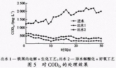 ÓÉͼ5¿ÉÖª£¬Ëæ×Å΢ÉúÎï¶ÔË®ÖʵÄÖð½¥ÊÊÓ¦£¬CODcrÈ¥³ýÂʽ¥½¥Éý¸ß£¬10 dºóÇ÷ÓÚÎȶ¨¡£³öË®CODcrΪ160¡«180 m#L£¬µÍÓÚ¡¶·Ä֯ȾÕû¹¤ÒµË®ÎÛȾÎïÅŷűê×¼¡·(GB 4287-1 992)¡«¼¶Åŷűê×¼ÒªÇó¡£ÔÎÛË®³§´¦Àí·ÏˮͣÁôʱ¼ä48 h£®¶øÔÚÁ¬ÐøÊÔÑéÖУ¬ÓÃÌúмÄÚµç½âÒ»Éú»¯¹¤ÒÕ´¦Àí¸ÃӡȾ·ÏË®£¬ÔÚ·ÏË®pHΪ5£¬Í£Áôʱ¼äΪ30hµÄÇé¿öÏ£¬CODcrÈ¥³ýÂʿɴﵽ9O%ÒÔÉÏ¡£