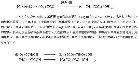 生物反硝化作用是反硝化细菌以有机碳为碳源,将硝酸氮还原为氮气而逸入空气中。反硝化细菌是兼性异氧菌。反应式为: