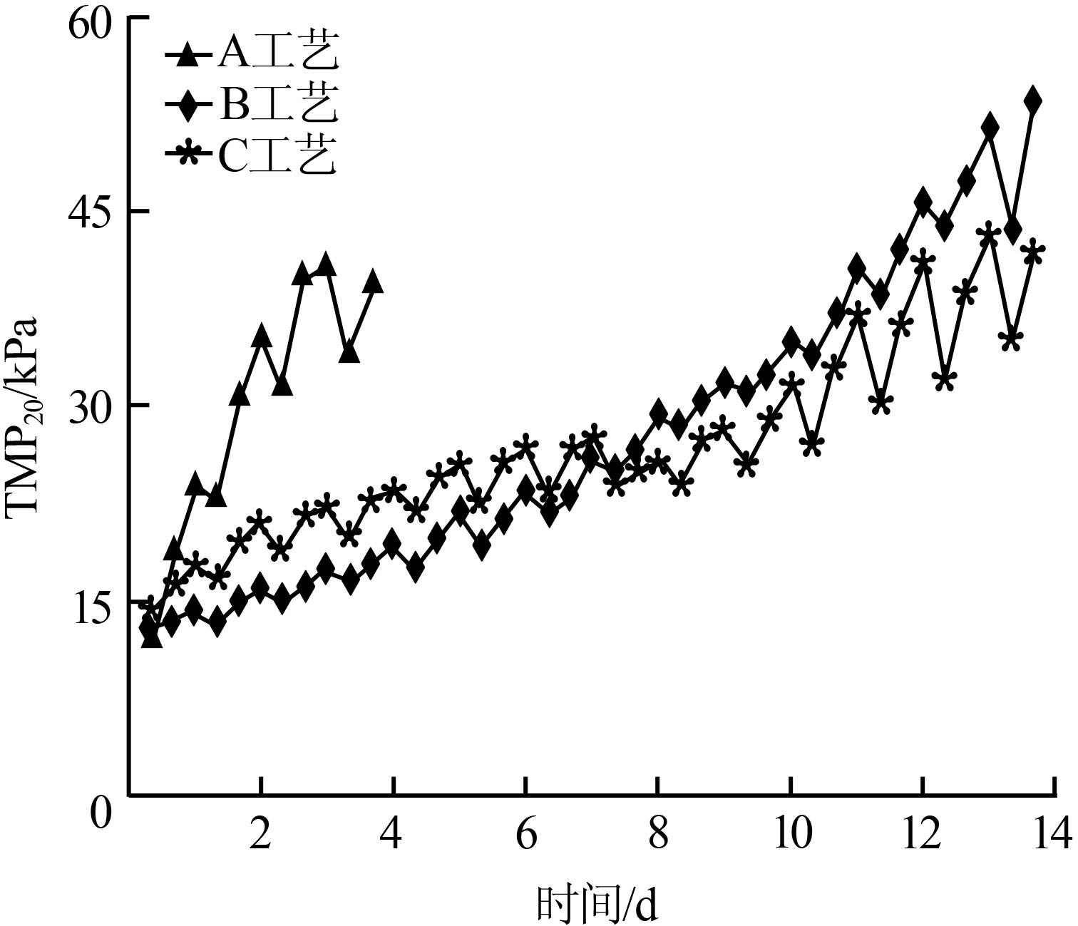 ÓÉͼ4¿É¼û£¬A¹¤ÒÕµÄTMP20Ôö³¤×î¿ì£¬½öÔËÐÐ4d£¬¼´ÓɳõʼµÄ12.49kPaÔö³¤Îª39.42kPa£¬Ôö³¤ËÙÂÊΪ7.69kPa/d¡£¶øB¡¢C¹¤ÒÕµÄTMP20Ôö³¤ËÙÂÊÔòÏÔÖøµÍÓÚA¹¤ÒÕ£¬¾¹ý14dµÄÔËÐУ¬B¹¤ÒÕµÄTMP20´Ó12.82kPaÉÏÉýÖÁ53.49kPa£¬Æ½¾ùÔö³¤ËÙÂÊΪ2.91kPa/d£»C¹¤ÒÕ×îÖÕTMP20Ϊ41.90kPa£¬Æ½¾ùÔö³¤ËÙÂÊΪ1.96kPa/d¡£