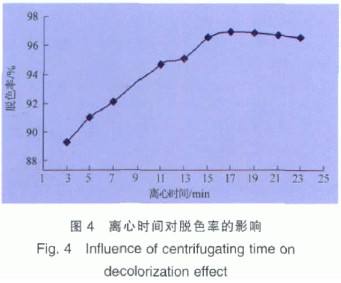 由图4可知,随着离心时间的增加,脱色率增大;当离心 时间达到17 min后,脱色率不随离心时间的变化而变化,基 本趋于稳定状态。本试验最佳离心时间为17 min。