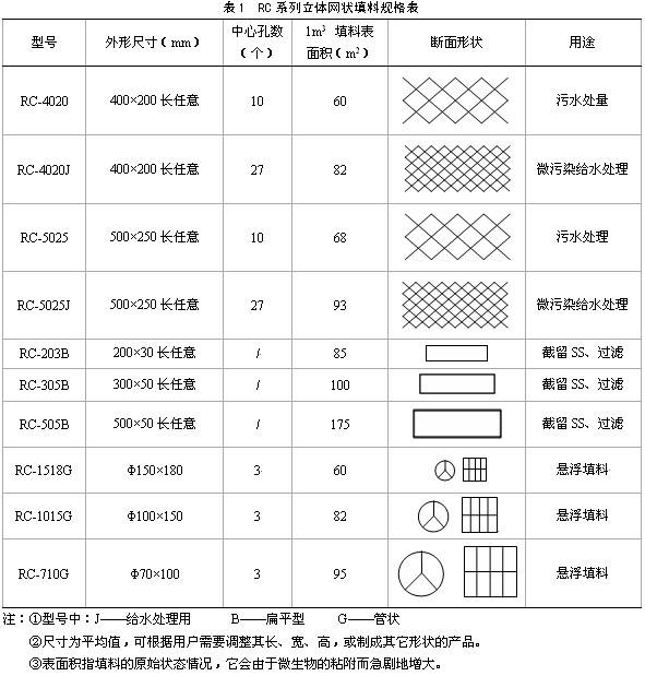 (1)从结构特点分析:RC型立体网状填料由于其交插螺旋网状特点,可使污水,空气和生物膜得到充分混渗接触交换,生物膜不仅能大量地在丝条上均匀坐床,保持良好的活性和孔隙可变性,而且在运行过程中气体在三维流动的污水带动下,互相碰撞并被螺旋网不断切割成更小的气泡,增加了氧的利用率,可减少曝气量,同时可使生物膜有良好的新陈代谢作用,不致粘连结团,因此它具有气泡切割能力强、空间体积利用率大、无死区等特点,是当前污水处理中性能指标较好的填料。