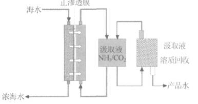 2005Ä꣬ÃÀ¹úҮ³´óѧM.Elimelech½ÌÊÚ¿ÎÌâ×鿪·¢ÁËÒ»ÖÖÕýÉøÍ¸º£Ë®µ»¯¼¼Êõ¡£ÕâÏî¼¼ÊõµÄ¹Ø¼üÔÚÓÚÆä¼³È¡Òº£¬ËüÊǽ«°±ÆøÓë¶þÑõ»¯Ì¼°´ÕÕÒ»¶¨±ÈÀý»ìºÏÈܽâÓÚË®ÖÐÅäÖÆ³ÉÒ»¶¨Å¨¶ÈµÄï§ÑÎÈÜÒº×÷Ϊ¼³È¡Òº£¬ÕâÖÖ¼³È¡Òº¼È¾ßÓнϸߵÄÉøÍ¸Ñ¹£¬ÓÖÄÜ·½±ãµØ´ÓË®ÖзÖÀ룬ͼ2Ϊ¸ÃϵͳʾÒâͼ¡²30¡³¡£¾Ý±¨µÀ£¬¼³È¡ÒºÅ¨¶ÈΪ6mol/Lʱ£¬ÆäÉøÍ¸Ñ¹´ï2.53¡Á107Pa£¬ÒÔ0.5mol/LNaClÈÜÒº×÷ÔÁÏÒº£¬ÏµÍ³ÉøÍ¸Ñ¹²î´ï2.17¡Á107Pa¡£¶ÔÓÚÏ¡ÊͺóµÄ¼³È¡Òº£¬½«Æä¼ÓÈȵ½60¡æ£¬ÆäÖеÄï§Ñα»·Ö½âΪ°±ÆøºÍ¶þÑõ»¯Ì¼£¬²ÉÓúÏÊʵķ½·¨£¨ÈçÕôÁ󣩾ÍÄÜÓëË®·ÖÀ룬µÃµ½²úÆ·Ë®£¬·ÖÀë³öµÄ°±ÆøºÍ¶þÑõ»¯Ì¼¿ÉÒÔÑ»·Ê¹Óá£