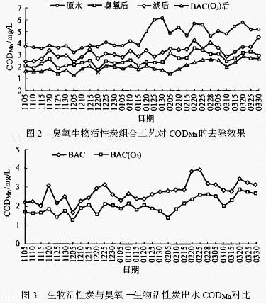 ³ôÑõ¶ÔÓлúÎï¾ßÓÐÒ»¶¨µÄÈ¥³ýЧ¹û,ÔÚ³ôÑõͶ¼ÓÁ¿²»ÊǺܴóµÄÌõ¼þÏÂ,¶ÔÓлúÎïµÄÑõ»¯×÷Óò»ÊǺÜÍêÈ«¡£µ¥´¿µÄ³ôÑõ»¯¹¤ÒÕ¶ÔCODMn µÄÈ¥³ýÂʽöΪ11 %¡«35 % ,ƽ¾ùÈ¥³ýÂÊΪ20 %;¶ø³ôÑõÓëÉúÎï»îÐÔÌ¿×éºÏ¹¤ÒÕ¶ÔCODMnµÄÈ¥³ýÂÊΪ25 %¡«60 % ,ƽ¾ùÈ¥³ýÂÊΪ37 %(¼ûͼ2) ¡£±È½Ïͼ3 Á½Ì×¹¤ÒÕÁ÷³ÌµÄÉúÎï»îÐÔÌ¿³öË®¿ÉÖª,³ôÑõ»¯ºóË®ÖÐÓлúÎï¸üÒ×±»ÉúÎï»îÐÔ̿ȥ³ý,¾³ôÑõÑõ»¯ºóµÄBAC (O3 )(ÉúÎï»îÐÔÌ¿) ¶ÔCODMnµÄƽ¾ùÈ¥³ýÂÊΪ21 % ,²»¾³ôÑõ»¯µÄBAC(ÉúÎï»îÐÔÌ¿) ¶ÔCODMn µÄƽ¾ùÈ¥³ýÂÊΪ16 %¡£