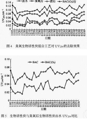 µ¥´¿µÄÉúÎï»îÐÔÌ¿¶ÔUV254 ÓÐÒ»¶¨µÄÈ¥³ý,µ«Ð§¹û²¢²»Ê®·ÖÃ÷ÏÔ,Æäƽ¾ùÈ¥³ýÂʽöÓÐ20. 92 %¡£³ôÑõÄܹ»ÓëÓлúÎïµÄ¡ªC = C ¡ªË«¼ü·´Ó¦,¶Ô±½»·¾ßÓÐÒ»¶¨µÄÆÆ»µÄÜÁ¦,´Ó¶øÊ¹ÓлúÎïµÄ·¼ÏãÐÔ½µµÍÉõÖÁÏûʧ¡£Òò´Ë¾¹ý³ôÑõ»¯ºóÆäÄܹ»±íʾ·¼Ïã»·½á¹¹»ò¹²éîË«¼ü½á¹¹ÓлúÎïµÄUV254 Ã÷ÏÔ½µµÍ,ƽ¾ùÈ¥³ýÂÊÄܹ»´ïµ½41. 8 %¡£³ôÑõÉúÎï»îÐÔÌ¿¹¤ÒÕ¶ÔUV254 µÄÈ¥³ýÂʴ󲿷ÖÊÇÓɳôÑõµÄÑõ»¯×÷ÓÃʵÏÖµÄ(¼ûͼ4) ,¸Ã×éºÏ¹¤ÒÕ¶ÔUV254 µÄƽ¾ùÈ¥³ýÂÊ´ïµ½58. 2 % ,Ô¶Ô¶¸ßÓÚµ¥´¿²ÉÓÃÉúÎï»îÐÔÌ¿¹¤ÒÕËùÄÜÈ¥³ýµÄ20. 92 %(¼ûͼ5) ¡£