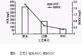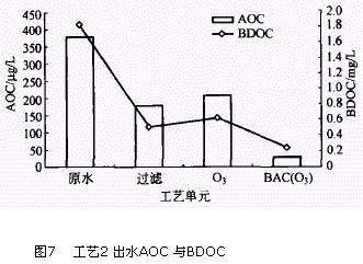 ±È½ÏÁ½¸ö¹¤ÒÕ(ͼ6ºÍͼ7) ¿ÉÒÔ¿´³ö,µ¥´¿µÄÉúÎï»îÐÔÌ¿¹¤ÒÕ¶ÔAOC µÄÈ¥³ýÂÊΪ60 % ,³ôÑõÉúÎï»îÐÔÌ¿ºóÏà¶ÔÓÚ¹ýÂ˹¤ÒÕ,È¥³ýÂÊ´ïµ½86. 5 %¡£³ôÑõÑõ»¯ºóË®ÖÐBDOC ºÍAOC Ũ¶ÈÉÏÉý,ÕâÊÇÒòΪ³ôÑõÑõ»¯Ë®Öв¿·Ö´ó·Ö×ÓÓлúÎïʹ֮Éú³ÉÏà¶Ô·Ö×ÓÖÊÁ¿½ÏСµÄÖмä²úÎï,ÕâЩ²úÎïÄܹ»±»ÒìÑø¾úÀûÓÃ,Ôì³ÉAOC ºÍBDOC µÄÔö¼Ó¡£±¾ÊÔÑéÖÐÒÔ³ôÑõ³öË®×÷ΪBAC ½øË®Ê±, AOC µÄÈ¥³ýÂÊΪ88. 5 %¡£BDOC µÄÈ¥³ý¹æÂɺÍAOC ±È½ÏÒ»Ö¡£Í¨¹ý·ÖÎö¿ÉÖª,³ôÑõÉúÎï»îÐÔÌ¿¹¤ÒÕ³öË®Öк¬ÓеĿÉÉúÎï½µ½âÐÔÓлúÎﺬÁ¿²»½öµÍÓÚ³£¹æ´¦Àí,¶øÇÒÒ²µÍÓÚµ¥´¿µÄÉúÎï»îÐÔÌ¿¹¤ÒÕ¡£