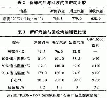 经测定,长岭分公司常温轻柴油吸收法油气回收装置油气回收率平均为80% 左右,采用吸收法和吸附法联合运用的油气回收装置其油气回收率可达95% 以上。油品蒸发损耗的物质主要是轻烃组分。通过对“新鲜汽油”(从加油站刚购买的汽油)、“用过汽油”(油罐多次周转蒸发试验后罐中的汽油)及“回收汽油”的密度及馏程测试比较(如表2、表3所示),可以看出“回收汽油”的密度最轻,初馏点最低,馏程最窄,组分最轻。