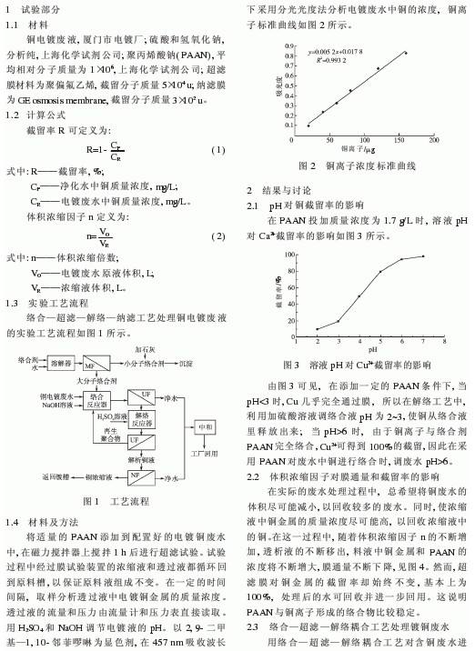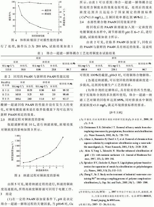 络合—超滤—解络—纳滤集成过程由以下连续的5个环节组成:(1)用大分子聚合物络合废水中的铜离子;(2)超滤铜金属络合物废水,在超滤过程中产生脱除了铜离子的净化水和浓缩的铜络合物;(3)通过酸化对浓缩液中的铜络合物进行解络;(4)超滤酸化后的浓缩液回收大分子络合物循环使用;(5)滤过液中含有较高浓度的铜离子,可通过纳滤浓缩回收铜返回到电镀工序。笔者研究采用络合—超滤—解络—纳滤耦合工艺浓缩和回收电镀铜液废水,探讨了pH、体积浓缩因子等因素对电镀铜废水处理效果的影响,从而确定了络合—超滤—解络—纳滤耦合过程处理电镀铜废水的最佳工艺条件。