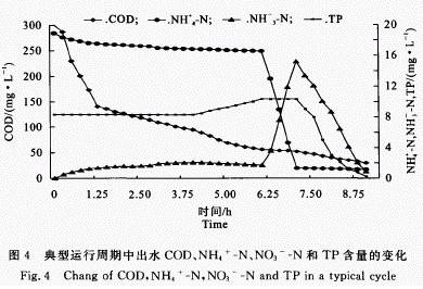 对SBR工艺一个典型运行周期内的出水水质作全程检测,分析其净水过程。一个典型运行周期出水COD、NH4+ -N、NO3- 一N 和TP含量的变化见图4。