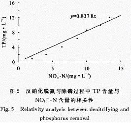 图5表明,TP含量与NO3- 一N 含量呈极显著性线性相关,相关系数高达97.9 9/6,证实了反硝化脱氮和除磷过程同时发生。这不仅避免了由于碳源不足对除磷过程的抑制作用,同时也减少了好氧摄磷过程所需的耗氧量。