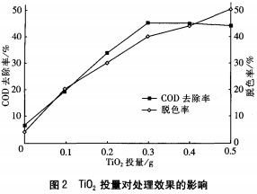 向盛有25mL造纸废液的反应器内分别加人TiO2为0,0.1,0.2,0.3,0.4,0.58,在温度为20℃的条件下用紫外灯照射3h后取样分析。COD去除率和脱色率随TiO2投量的变化如图2所示。