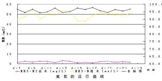 ÈçÉÏͼËùʾ£¬½øË®ÖеݱµªÔÚ50mg/L×óÓÒ£¬Ôڴ˸ººÉÏ£¬³öË®µÄ°±µª¿ÉÒÔ¿ØÖÆÔÚ3mg/LÒÔÏ£¬¾¹ýͶ¼ÓÂÈÆø£¬°±µªÔÚͶ¼ÓÂÈÆøµÄÑõ»¯×÷ÓÃÏ£¬³öË®°±µªÖµÐ¡ÓÚ1mg/L£¬´ïµ½Ò»°ãÑ»·ÀäÈ´Ë®µÄÖ¸±êÒªÇ󣬰±µªµÄÈ¥³ýÂÊÔÚ95%ÒÔÉÏ¡£¶ÔÓÚÒ»°ãµÄ³ÇÊжþ¼¶³öË®£¬°±µªÖµ½ÏµÍ£¬Ò»°ãСÓÚ15 mg/L£¬¾±¾¹¤ÒÕ´¦ÀíºóºÜÈÝÒ×Âú×ãÑ»·ÀäÈ´ÓÃË®±ê×¼¡£±¾´ÎʵÑé°±µªµÄÔËÐÐÈÝ»ý¸ººÉΪ1.07©K°±µª/m3d¡£