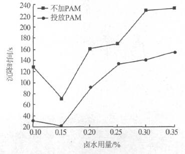 用石灰固定水样pH 为11~12,单独投加卤水,以25 mL 量筒作为沉降速度测量装置,考察卤水用量对沉降时间的影响,见图 1。