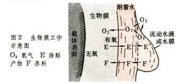 生物膜法中最常用的一种生物器。使用的生物载体是小块料(如碎石块、塑料填料)或塑料型块,堆放或叠放成滤床,故常称滤料。与水处理中的一般滤池不同,生物滤池的滤床暴露在空气中,废水洒到滤床上。布水器有多种形式,有固定式的,有移动式的。回转式布水器使用最广。它以两根或多根对称布置的水平穿孔管为主体,能绕池心旋转。穿孔管贴近滤床表面,水从孔中流出。布水器的工作是连续的,但对局部床面的施水是间歇的,这承继了污水灌溉间歇灌水的概念。滤床的下面有用砖或特制陶块、混凝土块铺成的集水层。再下面是池底。集水层和池外相通,既排水又通风。工作时,废水沿载体表面从上向下流过滤床,和生长在载体表面上的大量微生物和附着水密切接触(图2),进行物质交换。污染物进入生物膜,代谢产物进入水流。出水并带有剥落的生物膜碎屑,需用沉淀池分离。生物膜所需要的溶解氧直接或通过水流从空气中取得。在普通生物滤池中,生物粘膜层较厚,贴近载体的部分常处在无氧状态。