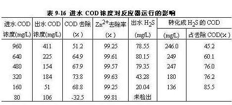 ´Ó±í9-16¿É¼û£¬³öË®CODËæ½øË®CODµÄ½µµÍ¶ø½µµÍ¡£·´Ó¦Æ÷ÖеÄÁò»¯ÇâŨ¶ÈËæ½øË®CODŨ¶ÈϽµ¶øÏ½µ¡£µ«Áò»¯ÇâŨ¶ÈΪ80mg/L×óÓÒʱ£¬½øË®CODÔö¼Ó²»»áµ¼ÖÂÁò»¯ÇâµÄÔö¼Ó¡£Òò´Ë£¬¿¼ÂÇ·´Ó¦Æ÷½øÐеÄÎȶ¨ÐԺͳöˮˮÖÊ£¬·ÏË®ÖÐÓªÑøÎïµÄ¼ÓÈëÁ¿Ó¦µ±¿ØÖÆÔÚ300mg/L×óÓÒ¡£