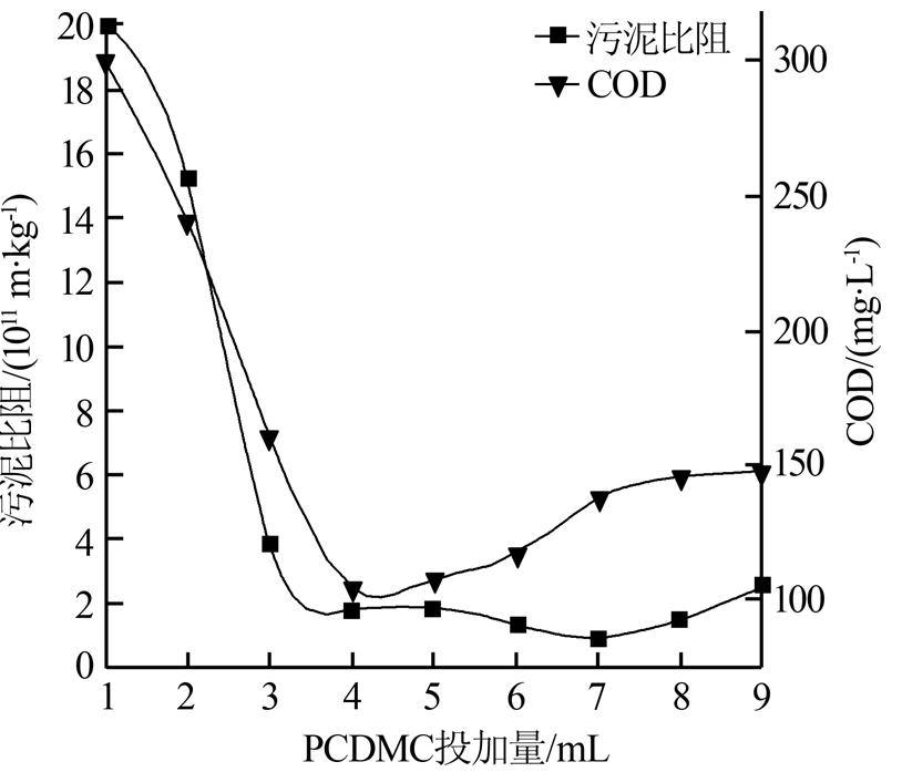 ¡¡¡¡Ã¿´Î²â¶¨Ç°£¬½«»îÐÔÎÛÄà³Áµí30 minºóÈ¥µôÉÏÇåÒº£¬ÔÚÊÒÎÂϽÁ°è¾ùÔÈ¡£Ëæºó·Ö±ðµ¹Èë9¸ö100 mLµÄÁ¿Í²ÖУ¬²¢ÒÀ´Î¼ÓÈëÖÊÁ¿Å¨¶ÈΪ1 g/LµÄPCDMCÈÜÒº1¡¢2¡¢3¡¢4¡¢5¡¢6¡¢7¡¢8¡¢9 mL£¬¿ìËÙ½Á°è30 sºóÔÙµÍËÙ½Á°è2 min¡£½øÐÐÎÛÄàÉÏÇåÒºCOD¼°ÎÛÄà±È×èµÄ²â¶¨£¬½á¹û¼ûͼ 2¡£