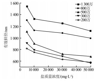 ¡¡¡¡ÊµÑé½á¹û±íÃ÷£¬µ±ÑÎÖÊÁ¿Å¨¶ÈΪ5 000¡«50 000 mg/Lʱ£¬¾ÛºÏÎïÔÚË®ÈÜÒºÖеÄÓÐЧÁ£¾¶´óС˳ÐòÒÀ´ÎΪ·ÇÀë×Ó¾Û±ûÏ©õ£°·>ÑôÀë×Ó¾Û±ûÏ©õ£°·>ÒõÀë×Ó¾Û±ûÏ©õ£°·;Ëæ×ÅÑÎŨ¶ÈµÄÔö¼Ó£¬·ÇÀë×Ó¾Û±ûÏ©õ£°·¡¢ÒõÀë×Ó¾Û±ûÏ©õ£°·¼°ÑôÀë×Ó¾Û±ûÏ©õ£°·ÔÚË®ÈÜÒºÖеÄÓÐЧÁ£¾¶¾ùÓмõСÇ÷ÊÆ£¬µ±ÑÎÖÊÁ¿Å¨¶È> 10 000 mg/Lºó£¬ÑÎŨ¶ÈµÄÔö¼Ó¶Ô3ÖÖ¾ÛºÏÎïÔÚË®ÈÜÒºÖеÄÓÐЧÁ£¾¶µÄÓ°Ïì¾ùÖð½¥±äС¡£