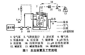 ·ÏË®¾ÓɽøË®±Ã´ÓË®ÏäÖÐÌáÉý½øÈë·´Ó¦Æ÷µ×²¿£¬¾·´Ó¦ºó´Ó³öË®¿Ú½øµ½³Áµí³ØÖУ¬³ÁµíºóµÄÉÏÇåÒºÅÅ×ߣ¬ÎÛÄàÔò¾ÎÛÄà±Ã»ØÁ÷½øÈë·´Ó¦Æ÷µ×²¿¡£¿ÕÆøÍ¨¹ýÆø±Ã£¬¾ÆøÌåÁ÷Á¿¼Æ¿ØÖÆÆøÁ¿ºó½øÈë·´Ó¦Æ÷¡£·´Ó¦Æ÷ÖÃÓÚºãÎÂˮԡ[(35¡À1) ¡æ]ÖС£ÊÔÑéÖвÉÓÃÁËpHÔÚÏß¿ØÖÆ£¬Í¨¹ý×Ô¶¯Í¶¼ÓNa2CO3ÈÜÒº½«pHÖµ¿ØÖÆÔÚ7.0¡«7.8¡£