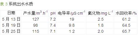¡¡¡¡´ËϵͳÔËÐÐ1 a£¬ÔËÐÐ×´¿öÁ¼ºÃ¡£ÏµÍ³²úË®Á¿Îª90¡«130 m3/h£¬Ë®»ØÊÕÂÊԼΪ60%£¬ÍÑÑÎÂÊ´ïµ½98%ÒÔÉÏ¡£ÏµÍ³ÔËÐÐË®ÖÊÇé¿ö¼û±í 3¡£