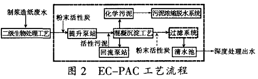 料 、 表面活性剂 、 酚类 、 苯类 、 有机氯 、 农药和石油化工产品等都有独特的去除能力 。 众所周知,活性炭最主要的性能是吸附性 . 它与 活性炭的比表面积和微孑L 隙结构有关。粉末活性炭微孑 L 的比表面积和比容积均很大, 因此其吸附能力非常强 。E C— P AC工艺具有的优点是~ 8 - 9 j : ( 1 ) 可充分 发挥粉末活性炭的吸附作用、助凝作用,起到强化混凝沉淀过程对污染物质,包括 B O D、 C O D、 色度等的去除效果,同时减少混凝剂的投加量 。( 2) 粉末活性炭可投加在原有絮凝沉淀或澄清工艺前, 依靠水泵、管道或接触装置充分地混合进行接触吸附.容易对现有混凝沉淀/过滤工艺进行升级改造。( 3 ) 粉末活性炭还可 以在沉淀和澄清后二次投加,提高吸附效果和出水水质。笔者采用 E C — P AC工艺处理制浆造纸废水,其工艺流程如图2所示。
