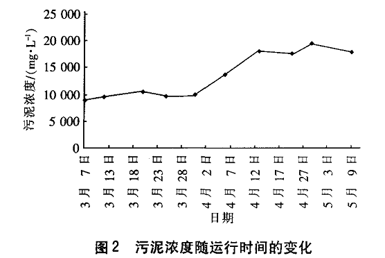 ÊÔÑ鿪ʼºóµÄ20¶àÌ죬·´Ó¦Æ÷ÎÛÄàŨ¶ÈΪ 9 000¡«10 000 mg£¯L£»Ëæ×ÅÔËÐÐʱÎʵÄÑÓ³¤£¬Ô¼10 d ×óÓÒ£¬ÎÛÄàŨ¶ÈÖð²½ÉýÖÁ18 000 mg£¯L£»¼ÌÐøÔËÐÐ20 ¶àÌ죬ÎÛÄàŨ¶È»ù±¾Î¬³ÖÔÚ18 000¡«19 000 mg£¯L£» ÔÚÖ®ºóµÄÔËÐÐÖУ¬ÎÛÄàŨ¶Èδ³ÖÐøÔö³¤£¬Î¢ÉúÎïÔöÖ³ ºÍ×ÔÉíÏû»¯´ïµ½¶¯Ì¬Æ½ºâ¡££¨¼ûͼ2£©
