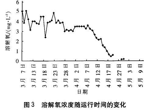 2.2ÈܽâÑõŨ¶ÈËæÔËÐÐʱ¼äµÄ±ä»¯ÔÚÊÔÑ鿪ʼºóµÄ2 0 d×óÓÒ£¬ ÈܽâÑõŨ¶ÈΪ4 m g £¯ L×óÓÒ£» Ëæºó 1 0 d×óÓÒ£¬ ÈܽâÑõŨ¶È½µµ½3¡« 3.5m g £¯ L £» ¼ÌÐøÔËÐÐ 2 0¶àÌì £¬ Èܽâ ÑõŨ¶ÈÖð½¥½µµ½0.5 m g £¯ L×óÓÒ£» Ö®ºó£¬ ÈܽâÑõŨ¶È½µµ½0.2 m g £¯ L×óÓÒ£¬ ·´Ó¦Æ÷ÒÑ´¦ÓÚȱÑõ״̬£¬¼ûͼ 3 ¡£