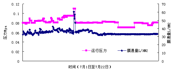 图1:超滤运行压力和膜透过量随时间变化曲线