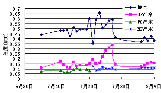超滤在双膜法处理印染废水中的作用在于去除水中的绝大部分大颗粒物质和胶体物质,为反渗透的正常稳定运行起保护作用,而作为反渗透预处理,衡量超滤出水的一个很重要的指标就是超滤产水的浊度和产水SDI。中试中超滤的浊度全部控制在0.3NTU以下,满足反渗透进水对浊度的要求。经过四十五天的连续试验,数据较充分,可以为大系统的设计提供借鉴和依据。