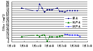 试验中采用了两支北斗星的低压4寸聚酰胺复合反渗透膜元件,废水首先经过了超滤系统的预处理,再以75%的回收率,使膜保持稳定运行,操作压力在9~10bar,膜透过通量为20-30l/h﹒m2;在上述操作工况下,经过现场连续做四十多天的试验。反渗透脱盐率稳定在95%以上,而NF-90的纳滤膜的脱盐率保持在80%以上,COD值也比较低,维持在20mg/l以内。