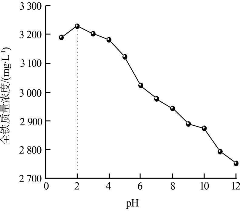 ¡¡¡¡ÓÉͼ 1¿ÉÖª£¬pHÔÚ1¡«2µÄ·¶Î§ÄÚ£¬·ÏÒºÖÐÈ«Ìú²â¶¨ÖÊÁ¿Å¨¶È´Ó3 189 mg/LÉÏÉýÖÁ3 228 mg/L£¬ÔÚpH=2.0ʱΪ×î´ó;Ëæ×Å·ÏÒºpHµÄ²»¶ÏÉý¸ß£¬È«ÌúŨ¶ÈÖð½¥Ï½µ£¬ÔÚpHΪ12ʱ£¬È«Ìú²â¶¨ÖÊÁ¿Å¨¶ÈΪ2 752 mg/L;µ±pH³¬¹ý12ºó´ïµ½13ʱ£¬·ÏÒºÖÐÈ«Ìú²â¶¨ÖÊÁ¿Å¨¶È·Ç³£Ð¡£¬Îª421 mg/L£¬¾¿ÆäÔÒòÊÇÓÉÓÚÈÜÒºÖÐpH¹ý¸ß²»ÄÜÐγÉÂçºÏÎï¶øÉú³ÉÁËÇâÑõ»¯Ìú³Áµí¡£Òò´ËÔÚÈ«Ìúº¬Á¿²â¶¨µÄ¹ý³ÌÖУ¬½«·ÏÒºµÄpH¿ØÖÆÔÚ2.0×óÓÒΪÒË¡£