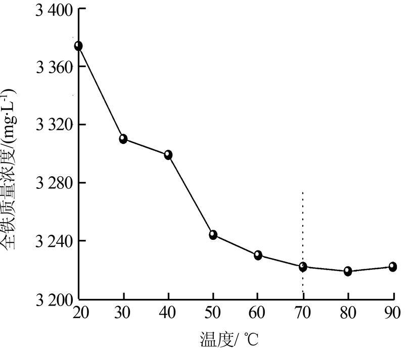 ¡¡¡¡ÓÉͼ 2¿ÉÒÔ¿´³ö£¬µ±·ÏҺζÈСÓÚ40 ¡æÊ±£¬È«Ìú²â¶¨ÖÊÁ¿Å¨¶È³¬¹ý3 300 mg/L£¬µÎ¶¨½á¹ûÆ«¸ß;Ëæ×ÅζȵIJ»¶ÏÉý¸ß£¬·ÏҺȫÌú²â¶¨µÄ½á¹ûÖð½¥½µµÍ²¢Ç÷ÓÚÎȶ¨£¬µ±Î¶ȴﵽ70¡¢80¡¢90 ¡æÊ±£¬È«Ìú²â¶¨ÖÊÁ¿Å¨¶È·Ö±ðÊÇ3 222¡¢3 220¡¢3 222 mg/L¡£¾¿ÆäÔÒò£¬Ö÷ÒªÊǽϵ͵ÄζÈÔڲⶨ¹ý³ÌÖлǻùË®ÑîËá»á³öÏÖ½©»¯ÏÖÏóµ¼Ö·¢ÉúÂçºÏÎﷵɫ£¬Òò¶ø²â¶¨Öµ¾«ÃܶȺÍ׼ȷ¶È½µµÍ£¬ËùÒÔÔÚÌí¼ÓÑõ»¯¼Áºó±ØÐë¼ÓÈȵ½70 ¡æ£¬ÕâÑù¼È¿ÉÒÔ¼õÉÙFe2+µÄÎü¸½£¬Ê¹Fe2+³ä·ÖÑõ»¯³ÉFe3+£¬Ò²¿ÉÒÔ·ÀÖ¹»Ç»ùË®ÑîËὩ»¯¡£