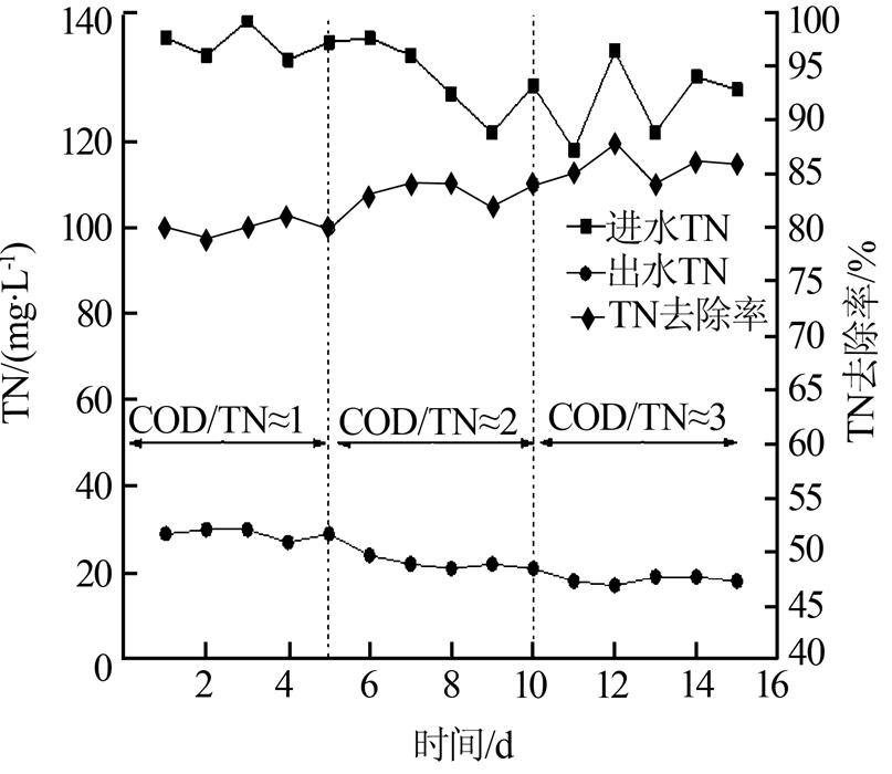 ¡¡¡¡ÊÔÑéÆÚ¼ä¿ØÖƽøË®Á÷Á¿28.8 L/d£¬·´Ó¦Æ÷ϵͳHRTΪ12.1 h£¬DOΪ1.90¡«2.10 mg/L£¬Ïõ»¯Òº»ØÁ÷±È150%£¬ÎÛÄà»ØÁ÷±È50%¡£ÒÔÆÏÌÑÌÇΪÓлú̼Դ£¬ÅäÖÆCODΪ200 mg/LµÄÓлúÌ¼Ô´ÓªÑøÒº£¬Í¨¹ý¼ÆÁ¿±Ã»ìºÏÔ·´Ó¦Æ÷½øË®£¬°´ÕÕCOD/TN·Ö±ðԼΪ1¡¢2¡¢3±ä»¯ÖУ¬¹²Í¬½øÈë·´Ó¦Æ÷ϵͳÖУ¬¼à²â¹¤ÒÕ¶ÔTNÈ¥³ýЧ¹û£¬½á¹û¼ûͼ 5¡£