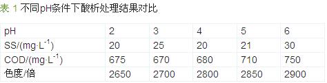 原水用3 mol/L的硫酸分别调节pH为2、3、4、5、6,搅拌絮凝后过滤,再测量酸析过滤后的SS、COD和色度。