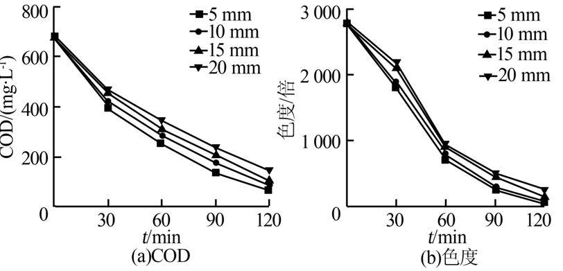 在相同条件下,极距越大,电流密度越小。使用自制氧化锡电极在NaCl添加质量浓度为2 g/L,pH=4条件下,研究了极距对电解过程中COD及色度变化的影响,结果见图 4。